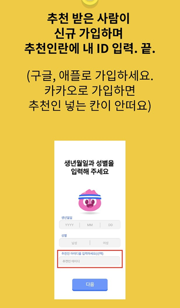 카카오톡 아이디로 가입 하시면 추천인을 못적는다고 합니다!