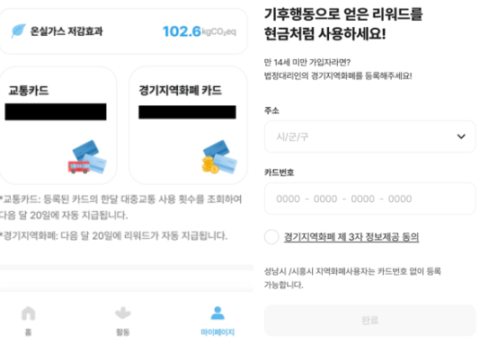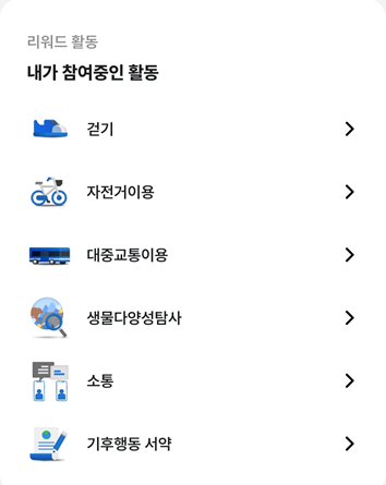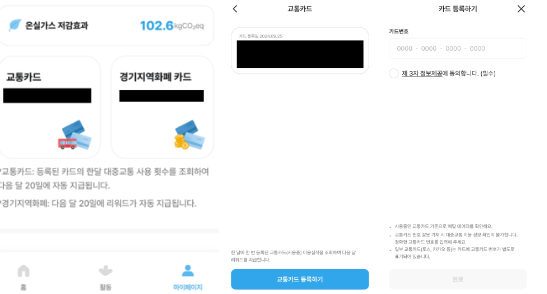 저는 걷기를 주로 하였고 가끔 대중교통도 이용하기에 대중교통 카드도 등록 완료 하였습니다.