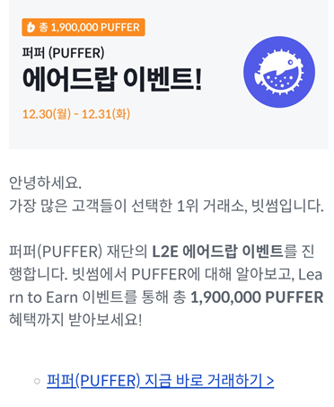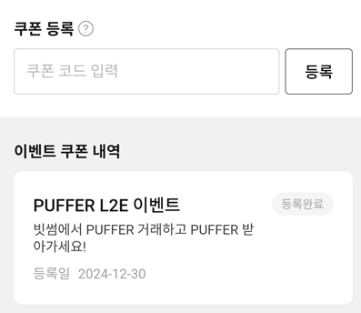 대상은 기간 내 쿠폰코드 및 PUFFER를 1회 이상 거래한 회원!
