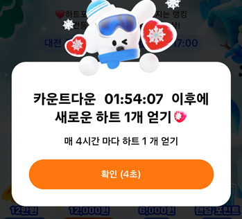 그리고 4시간마다 한번씩 클릭 할때 마다 ! 하트를 1개씩 얻을 수 있죠 ㅎㅎ
