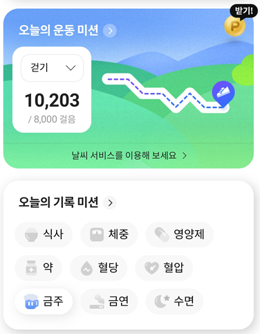 오늘의 운동미션 (8천보) / 오늘의 기록미션 (체중,금연,혈당,금주 등등)