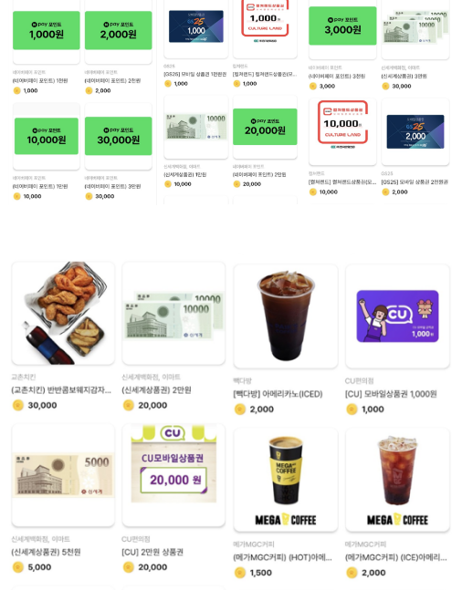 일단 네이버페이 기프티콘 / 치킨 기프티콘 / 문화상품권 등등 있습니다.