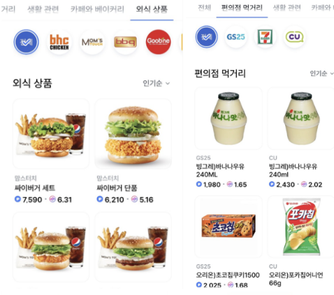 햄버거 / 각종 편의점 / 네이버페이 / 카페 등등