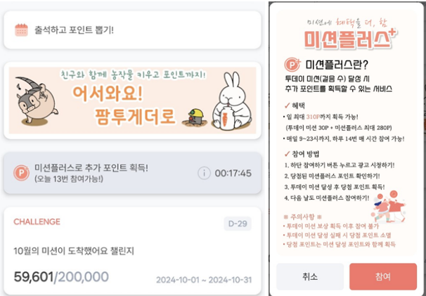투데이 미션 30포인트 + 미션플러스 @ 포인트 이고,