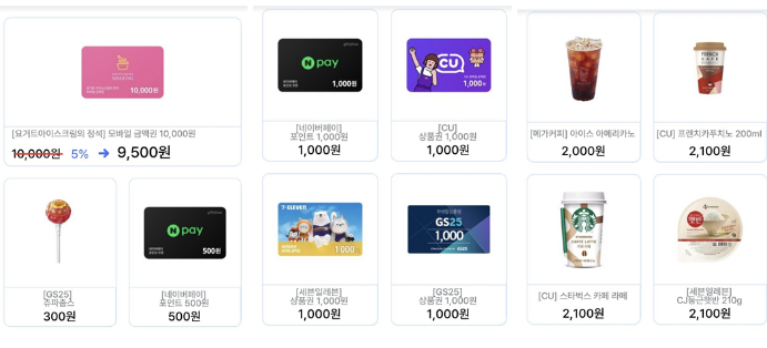 카페 기프티콘도 있고 , 편의점 기프티콘 , 요아정 기프티콘 등등